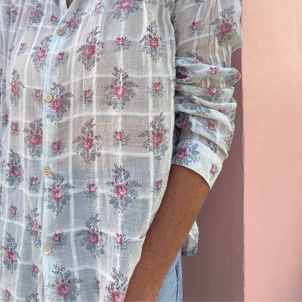 A no fuss sky blue floral shirt by BSBEE, with a soft collar and a straight loose fit to the body. Crafted in an incredibly light weight soft cotton, team with white jeans and sandals for those sunny days!