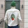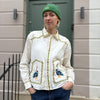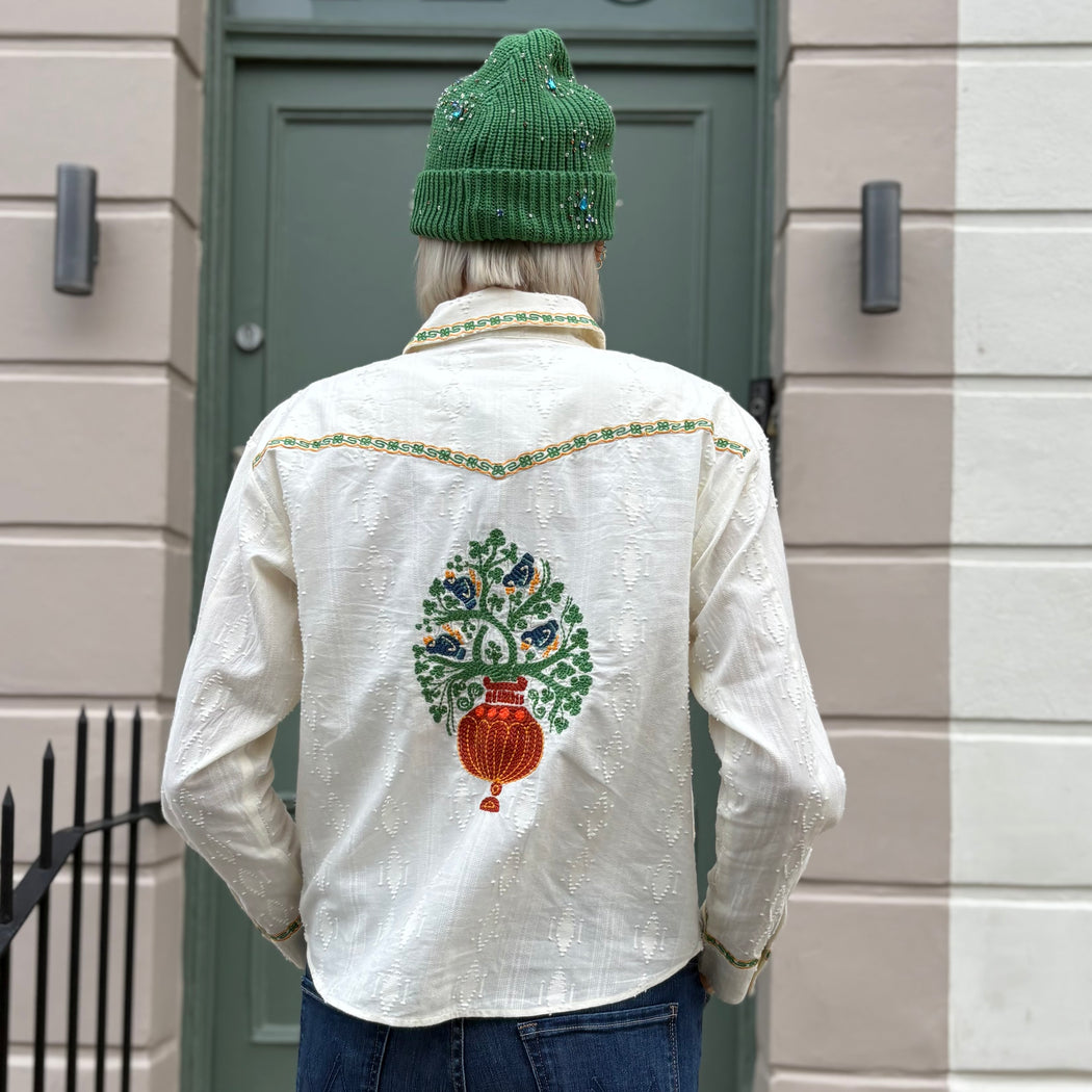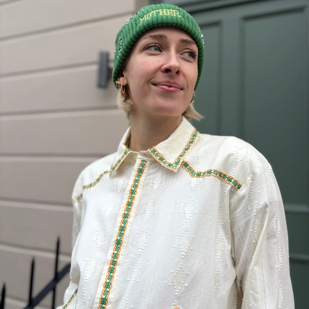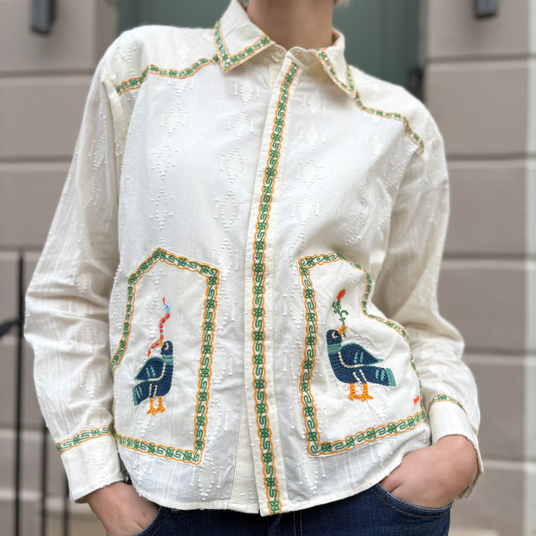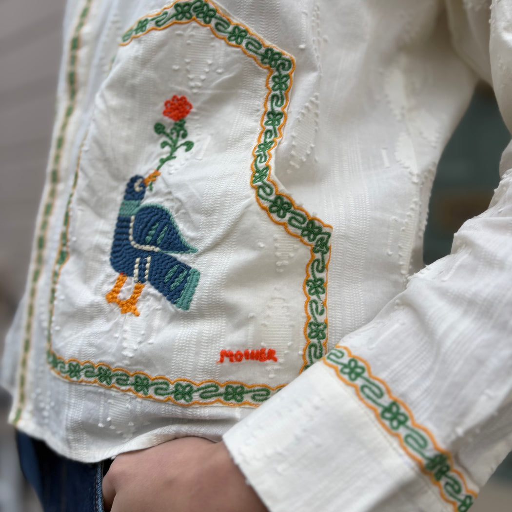 A button-up blouse with a Western-inspired yoke, patch pockets, slightly dropped shoulders and a curved hem. Made from 100% cotton in white with textured details, Folk Fable features a delicate stripe pattern, green and yellow trim and colorful embroidery on the front and back.