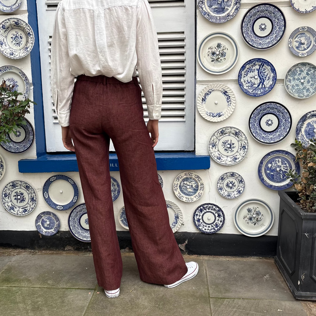 Tailored wide leg trousers crafted in a lightweight prune linen. Diega's androgynous femininity takes shape. Finished with a button zip closure and side pockets.