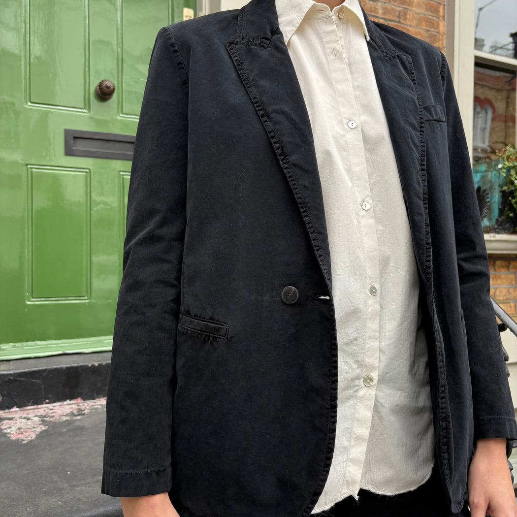 This blazer is crafted in a flocked cotton, with a velvety touch. A neat cut with a sleek look due to its fabric. To be worn casual or as a set with the matching trousers.