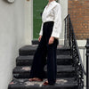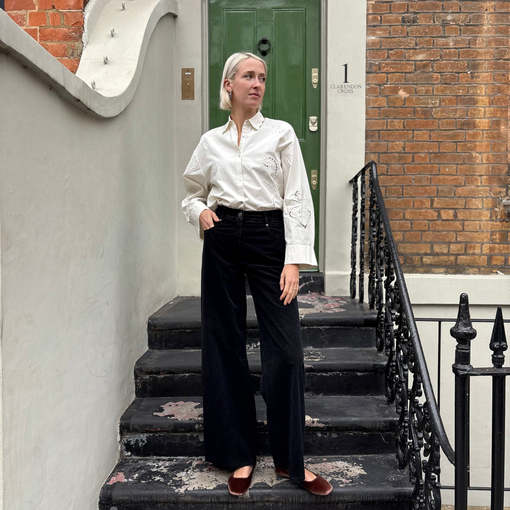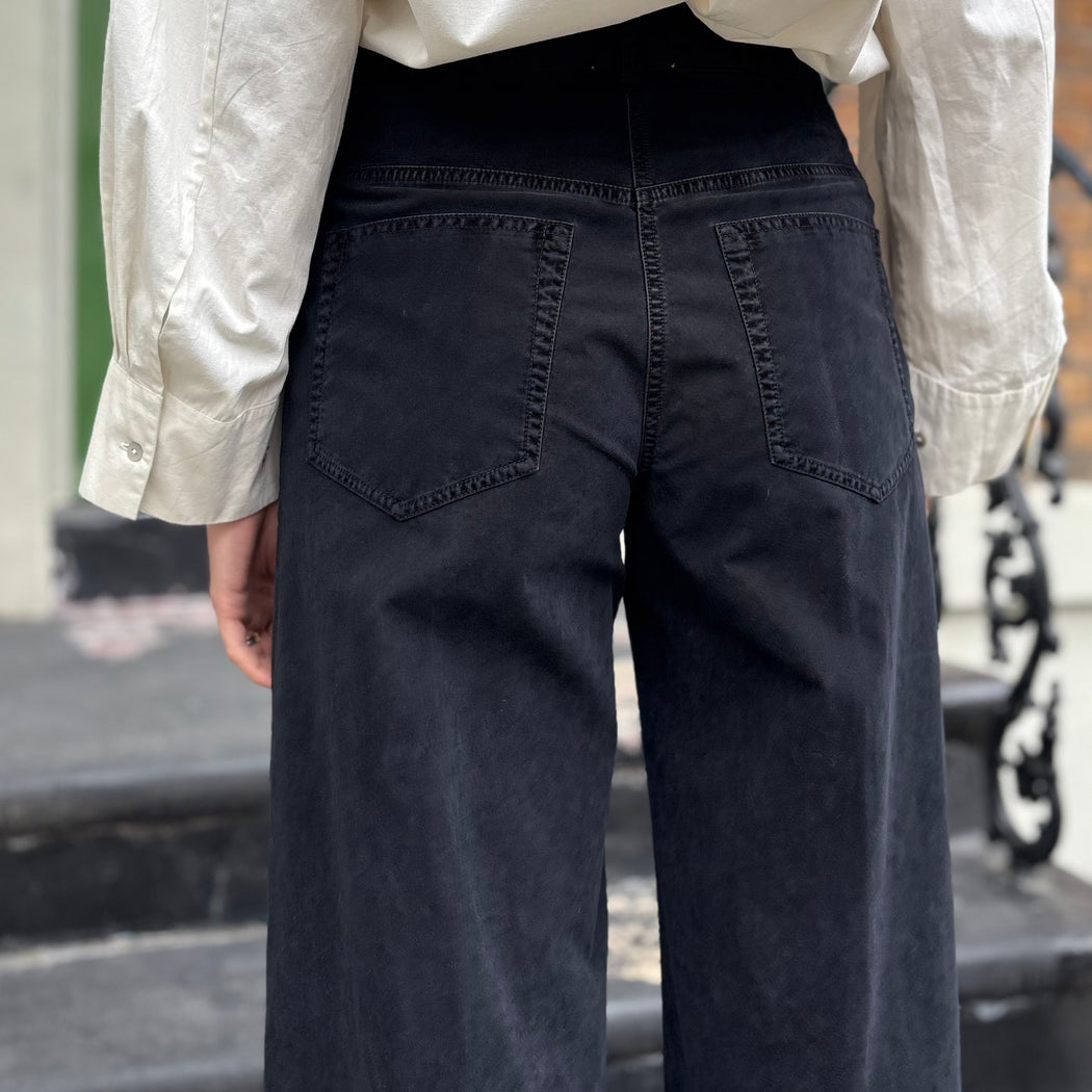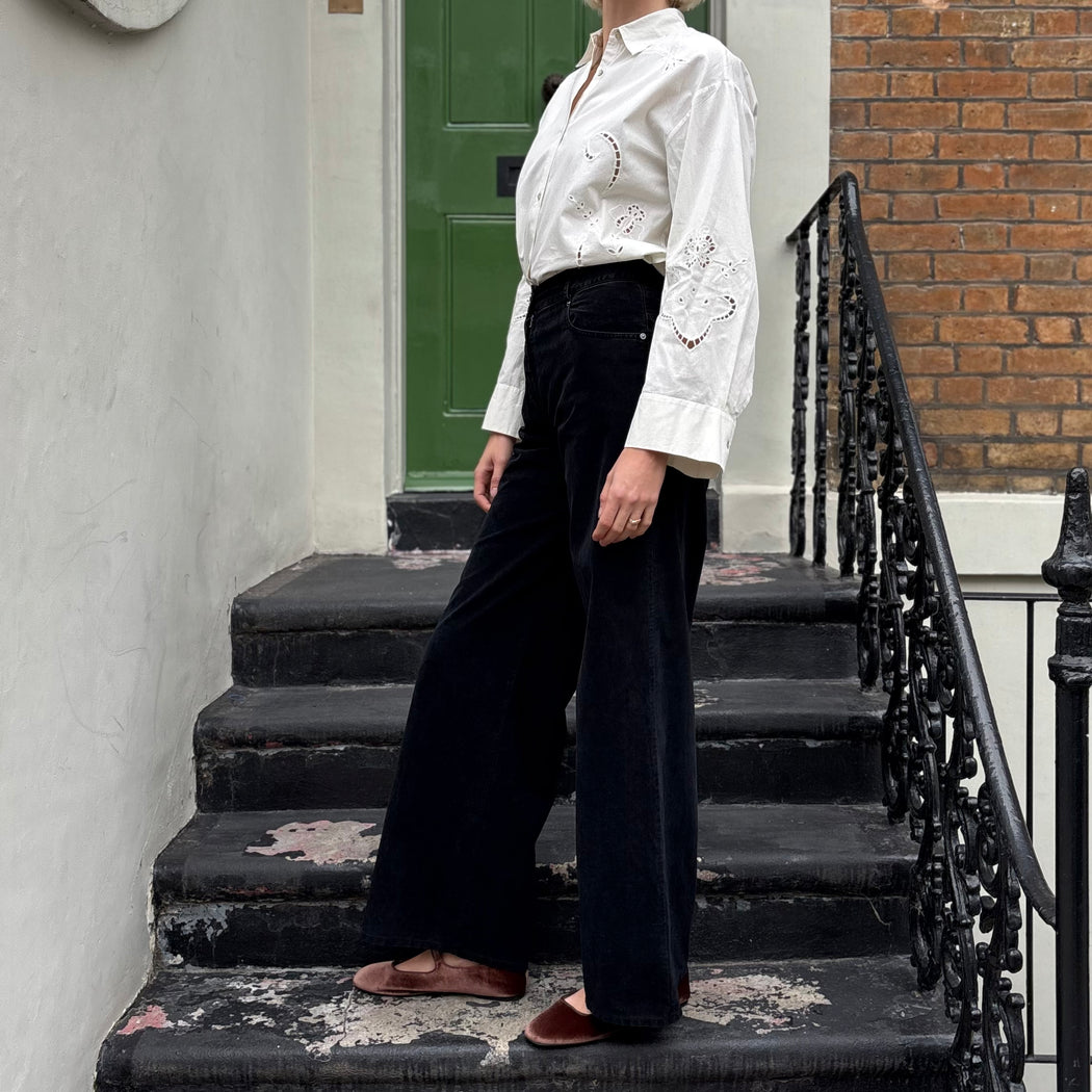 These trousers are crafted in a flocked cotton, with a velvety touch. High rise cut, super wide leg on a faded black fabric. A sleek trouser that could elevate any look. These trousers come up small.