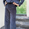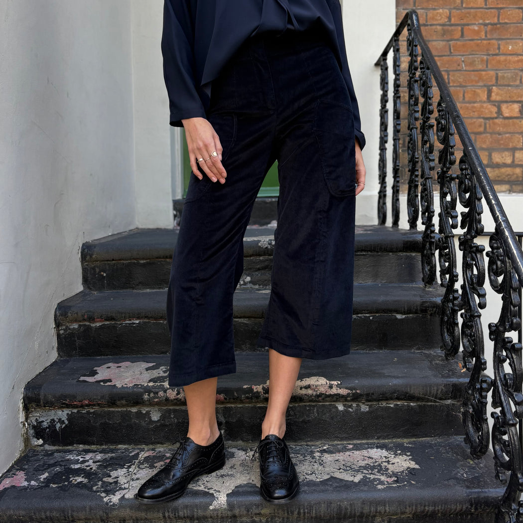 An ultra-soft corduroy cropped pant that features front patch pockets, a wide leg with curved silhouette. It has a front zip and hook closure. A soft narrow-wale cotton with a hint of elastane for that comfort of stretch.