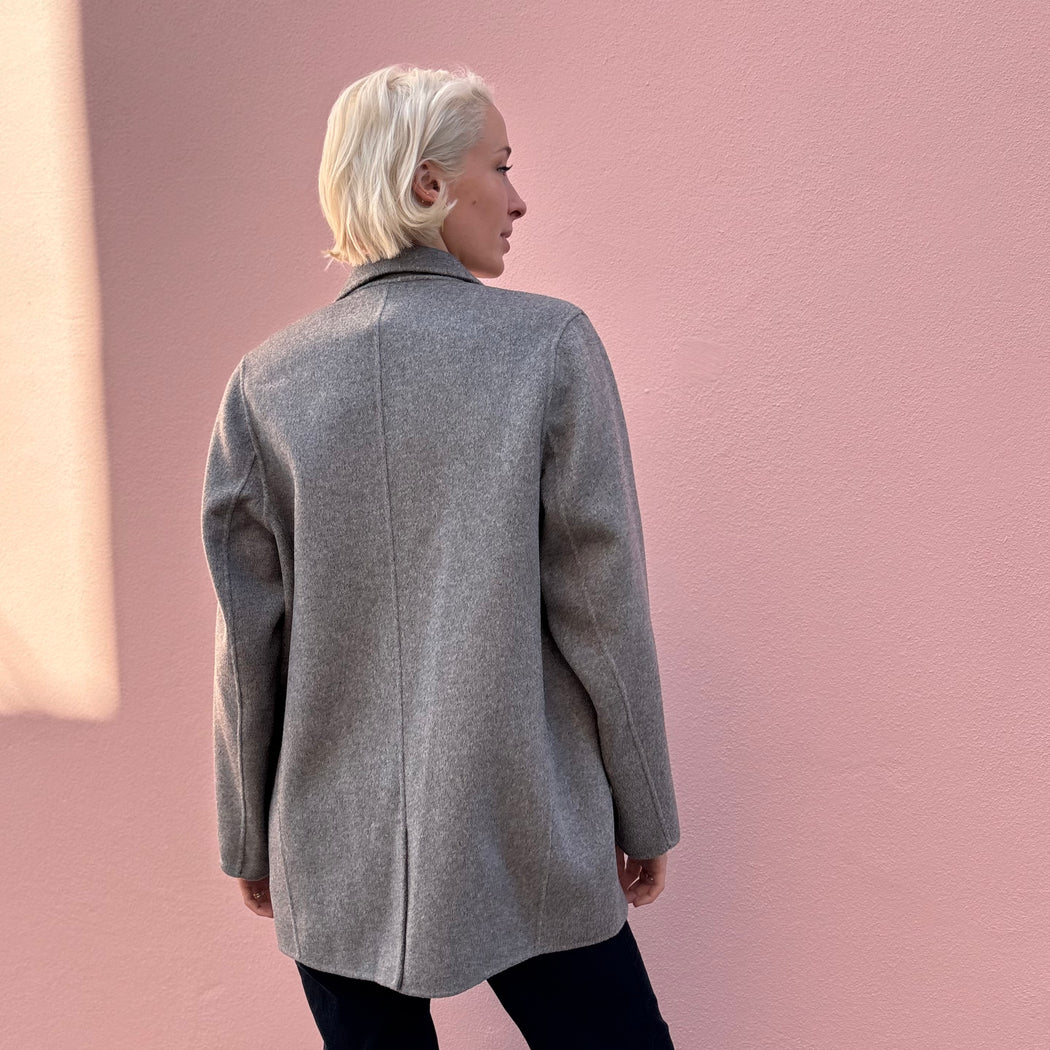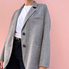A winter staple - this boyish, soft grey, slightly oversized jacket is perfect alternative to your winter coat. It has long sleeves and a tailor collar, with two button fastening and pockets.