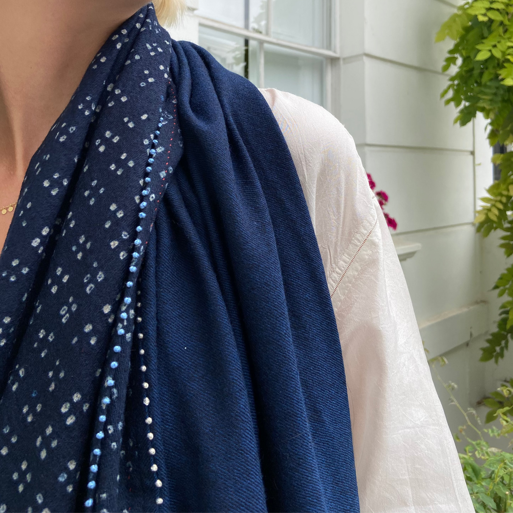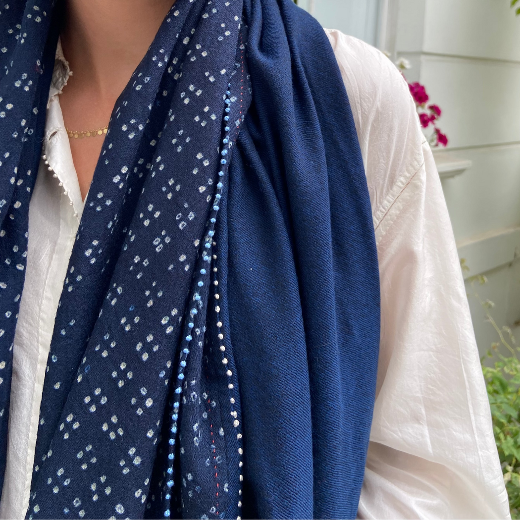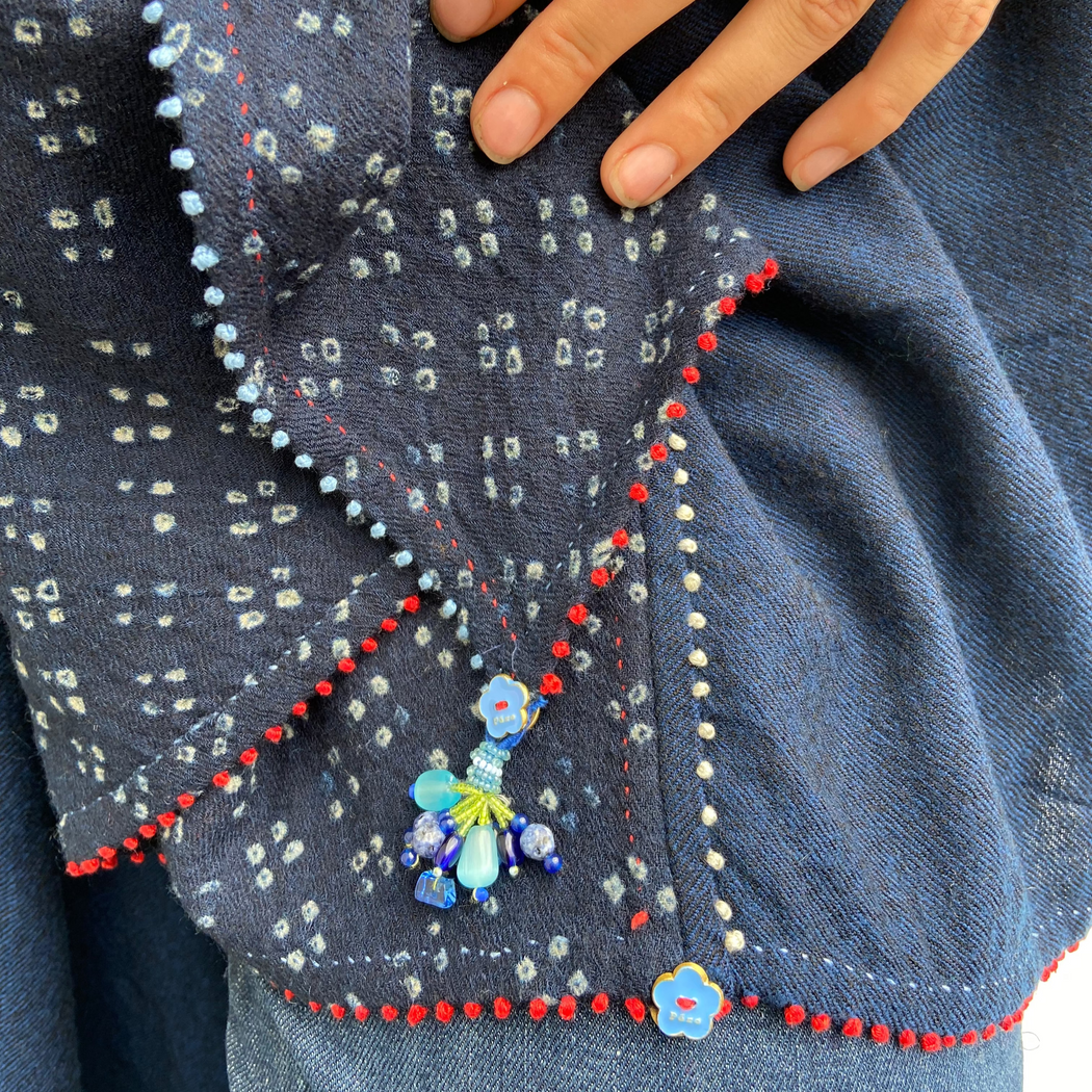 A stunning shawl, with all Pero's signature details throughout. Note the dot embroidery and the tie-dye dots. The beaded trimming is the cherry on top.