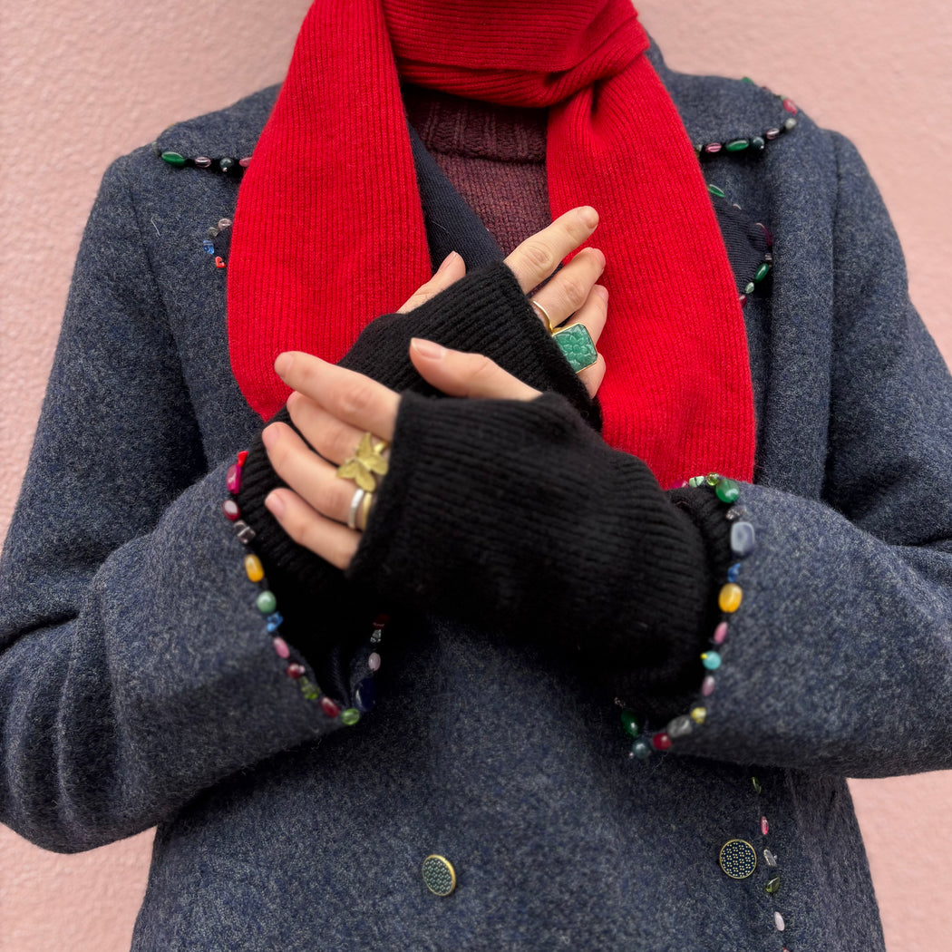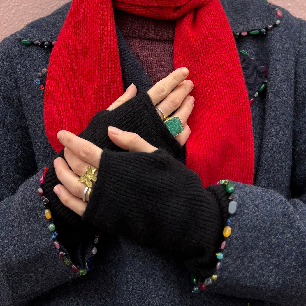 Knitted in their fine gauge machine in a full luxe fisherman's rib stitch, these comforting warmers are the perfect way to ward off the chills in style. Wear on their own or over gloves, simple & versatile with a side thumb hole