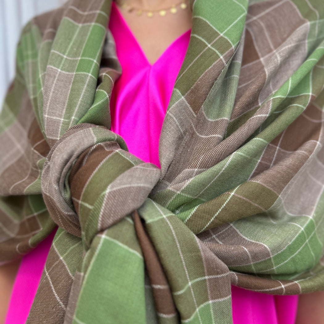 Yaser Shaw Apple Green and Organic Brown Check Shawl