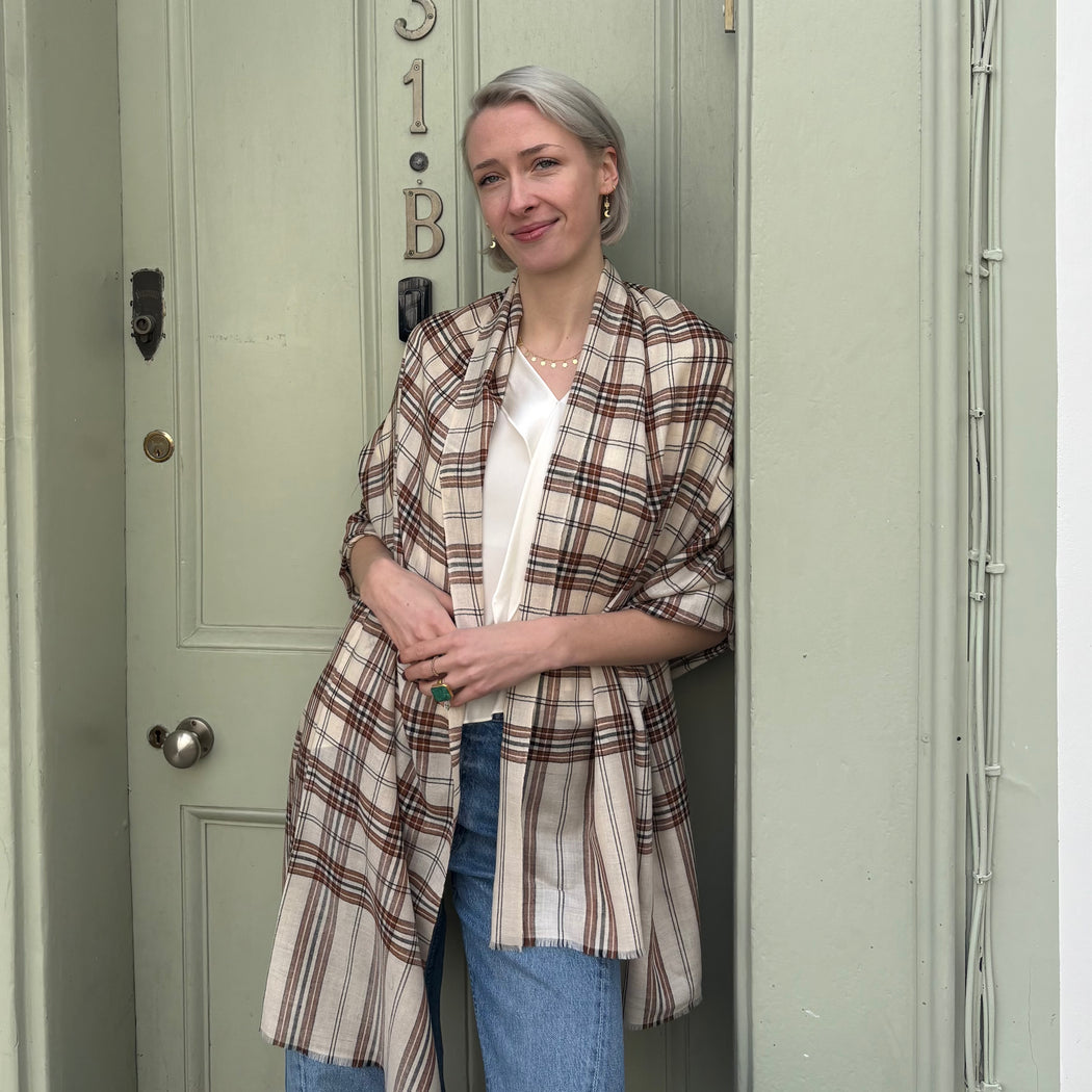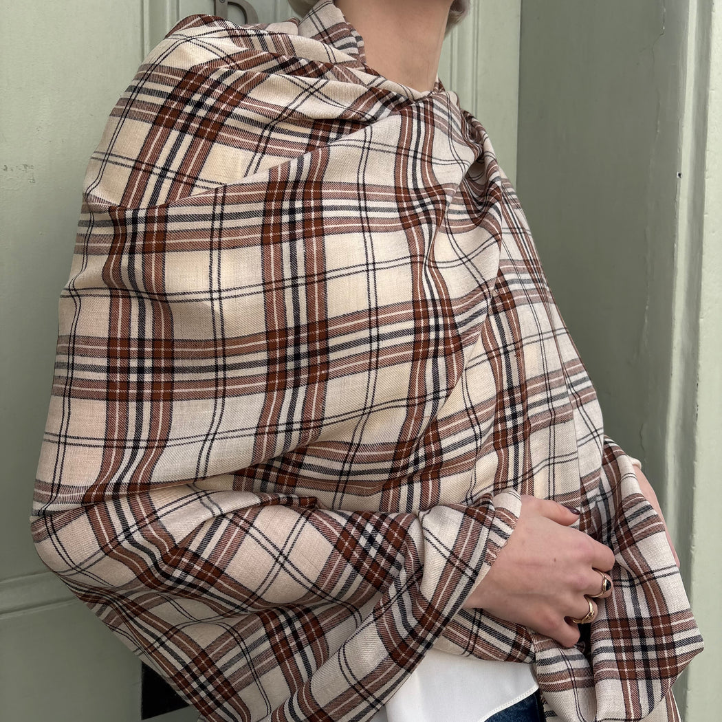 Yaser Shaw Cream Chocolate Check Shawl