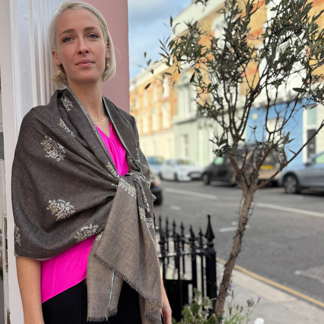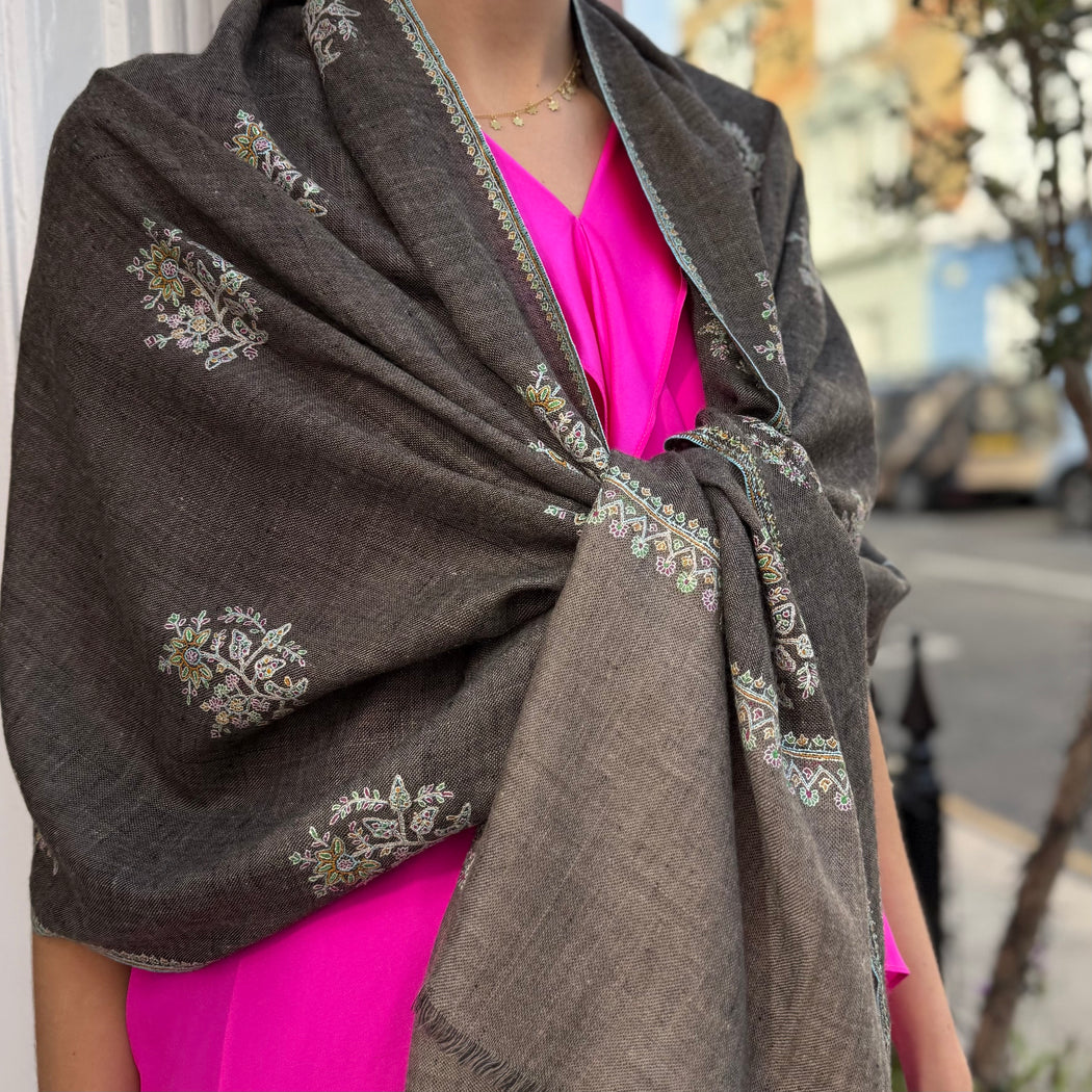 Yaser Shaw Organic Brown and Black with Blue Embroidered Edge Small Shawl
