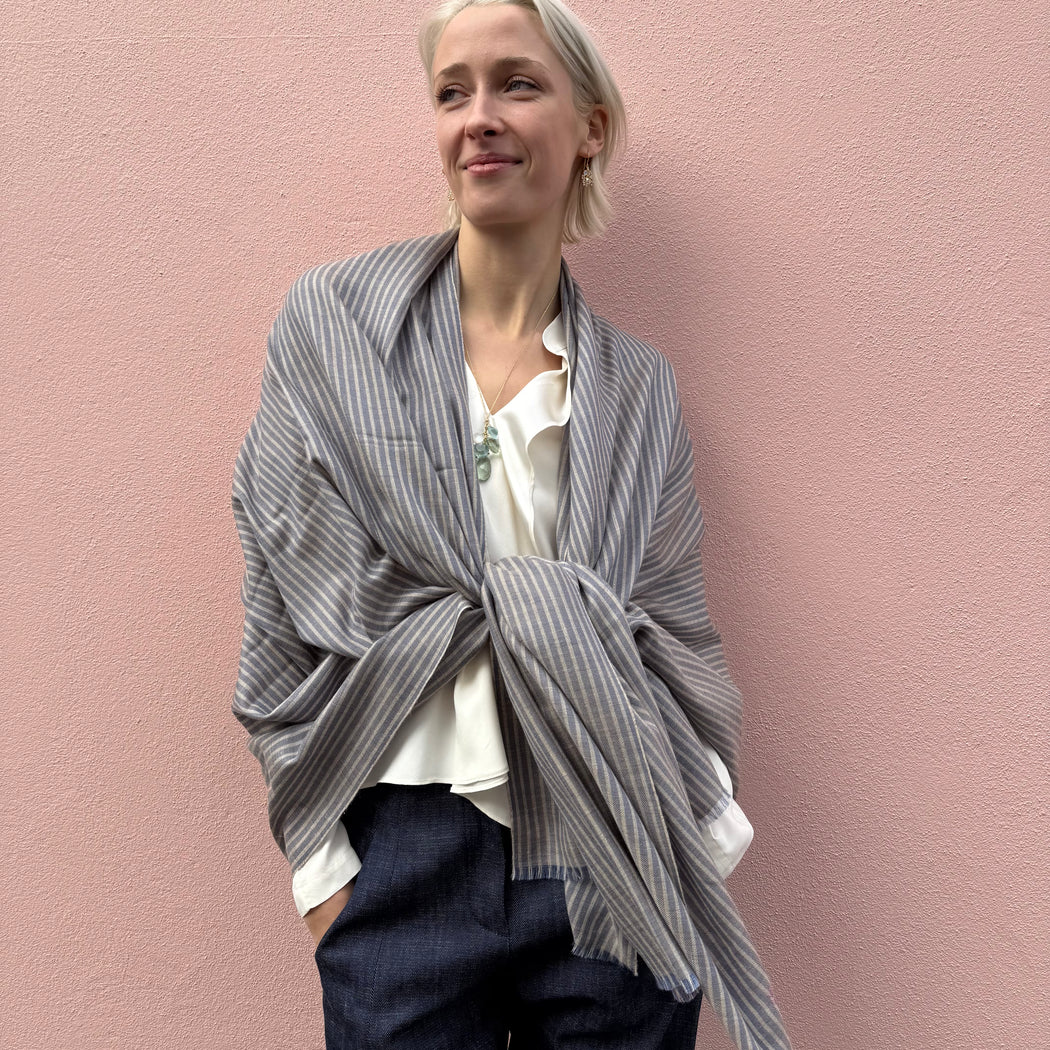 Yaser Shaw Greige and Blue Stripe Shawl