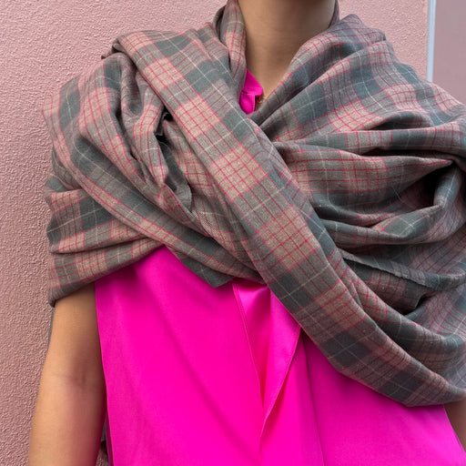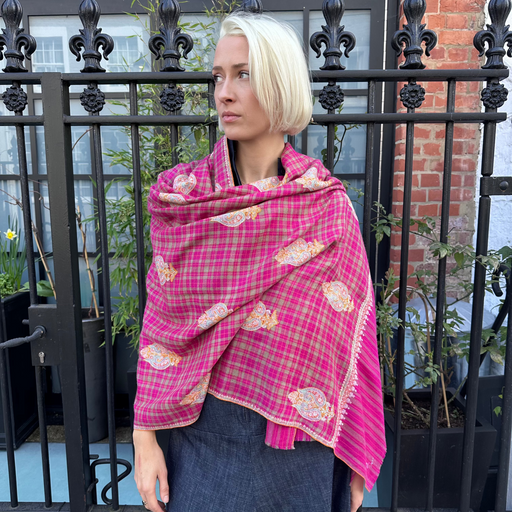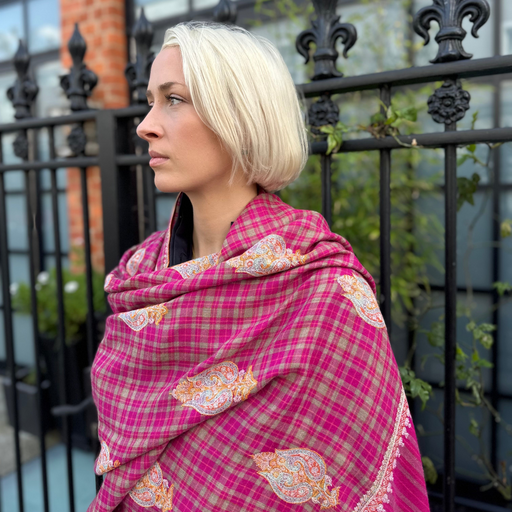 Yaser Shaw Fuchsia and Organic Brown Check Large Paisley Embroidered Shawl