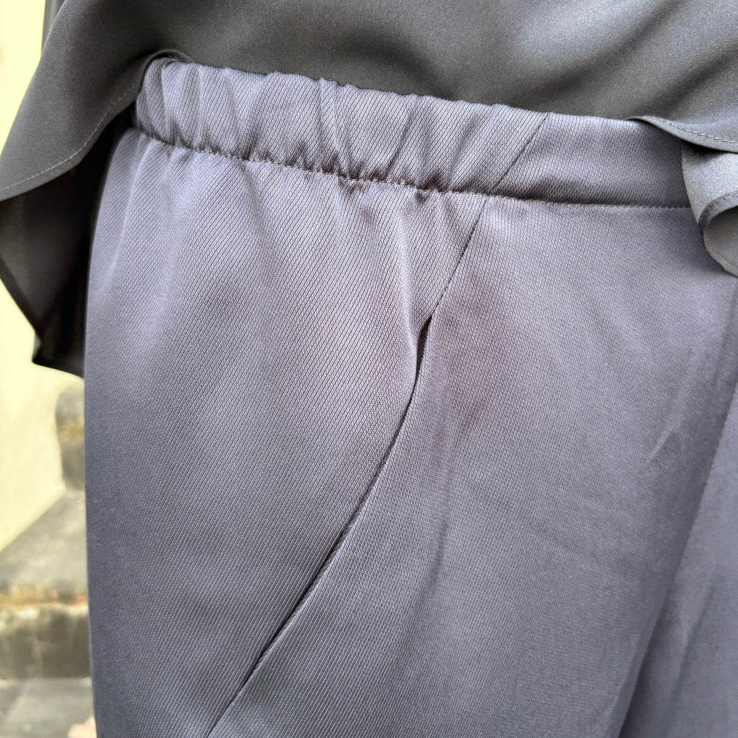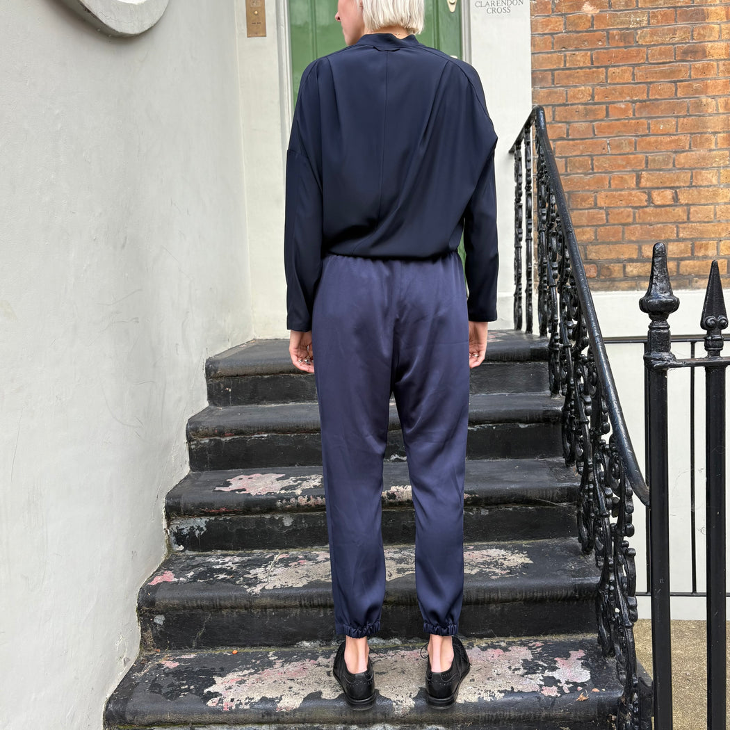 The best-selling Gabi Trousers in recycled drape feature hidden pockets on a curved front seam and an elastic detail at the back of the cuff. It has an elasticated waist and slips on.