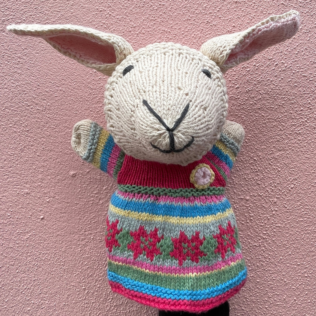 Hand knitted in a organic cotton, these friendly animal puppets are a great first gift for a new born right up to an older child who can play at their own pleasure!