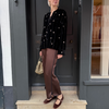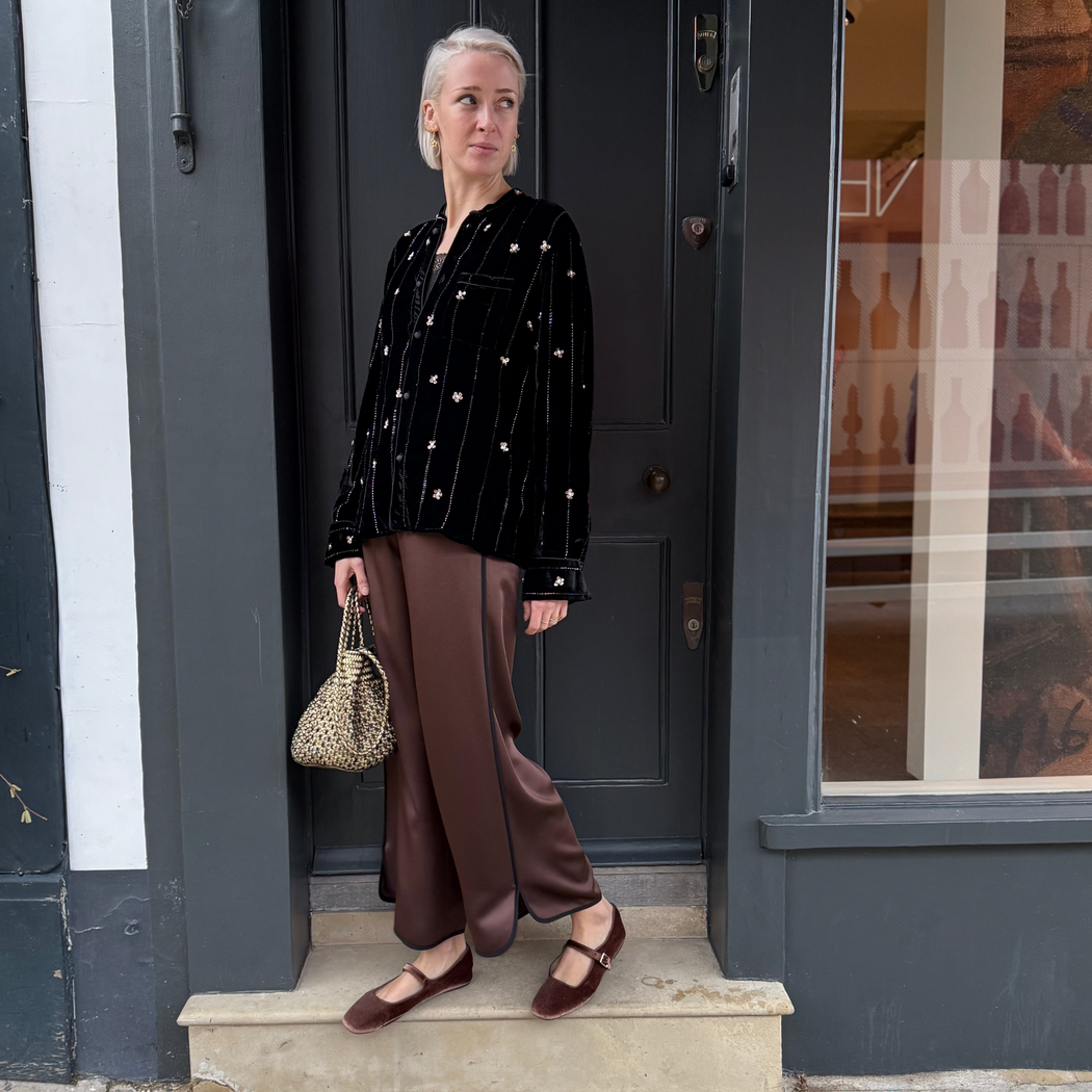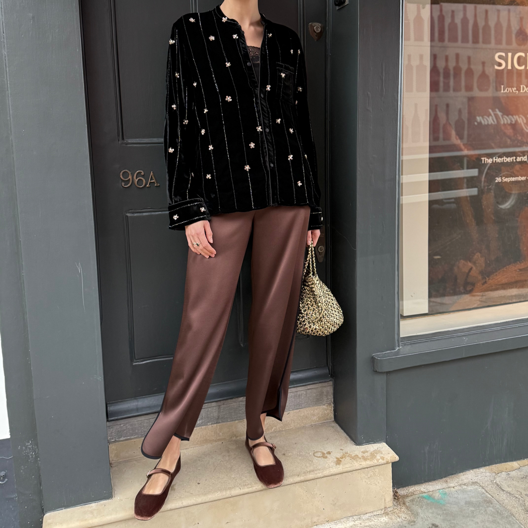 Envers satin trousers, fluid and flowing along the leg, with a pressed crease that elongates the silhouette. the flat front and elastic insert at the back of the waist offer a clean yet comfortable fit, designed for an easy—chic style from day to night. cropped hemline.