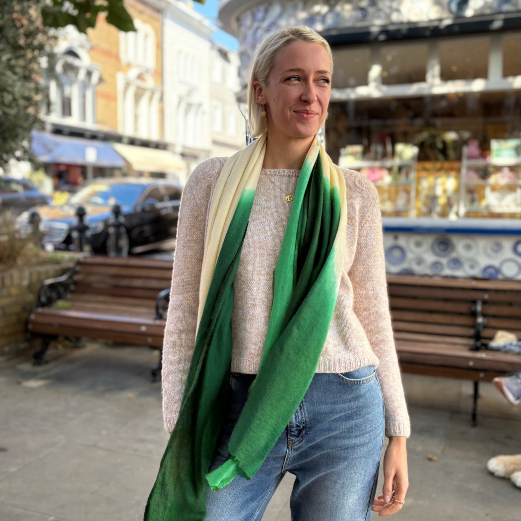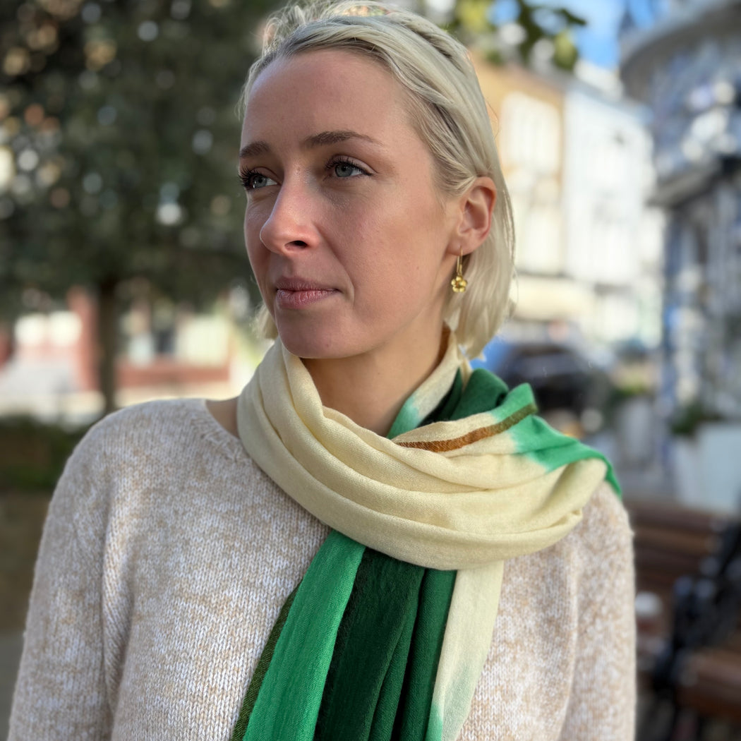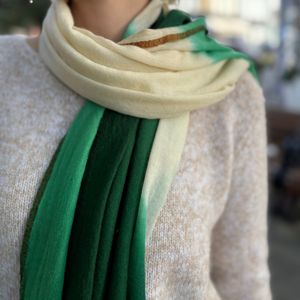 This scarf captures the spirit of the flags waving in stadiums to create a piece that is both graphic and refined. Its clean geometric shapes and tricolor palette come to life thanks to an artisanal dip-dye, which creates subtle interplay of shades.