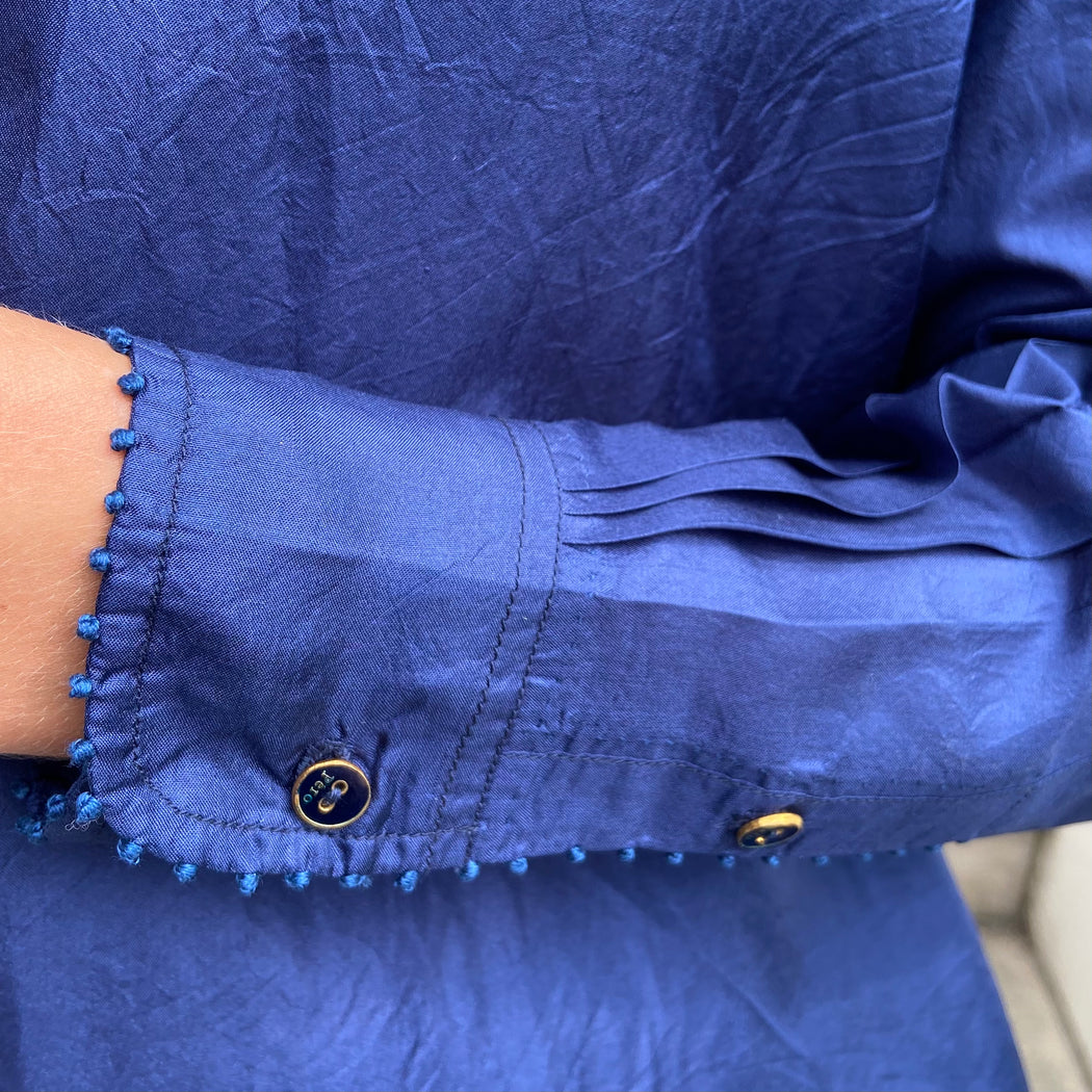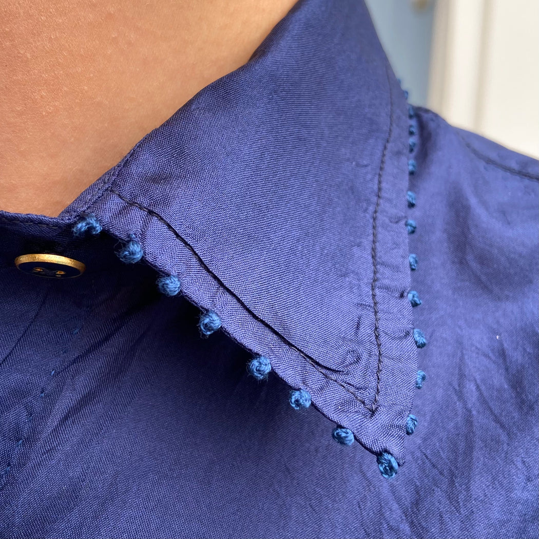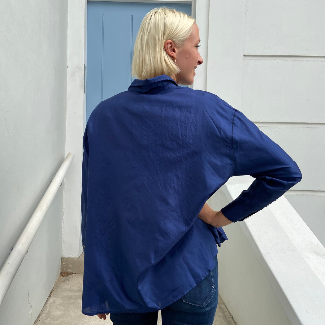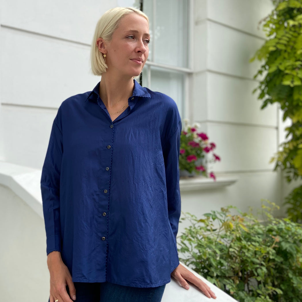 A simple yet striking silk shirt in deep navy, with Pero's signature dot embroidery detailing the shirts' edges. An oversized fit.