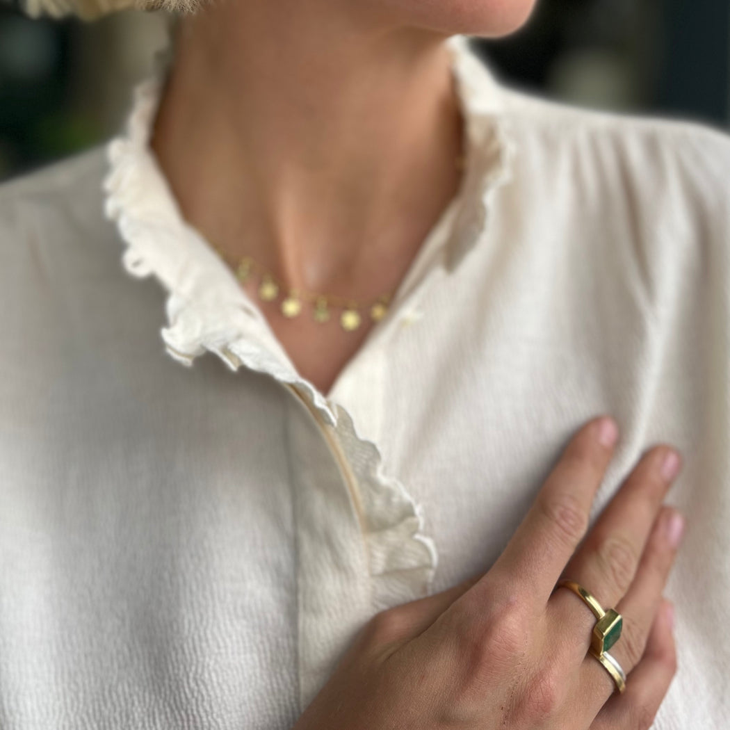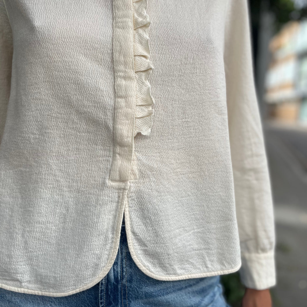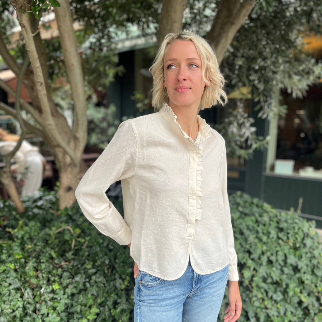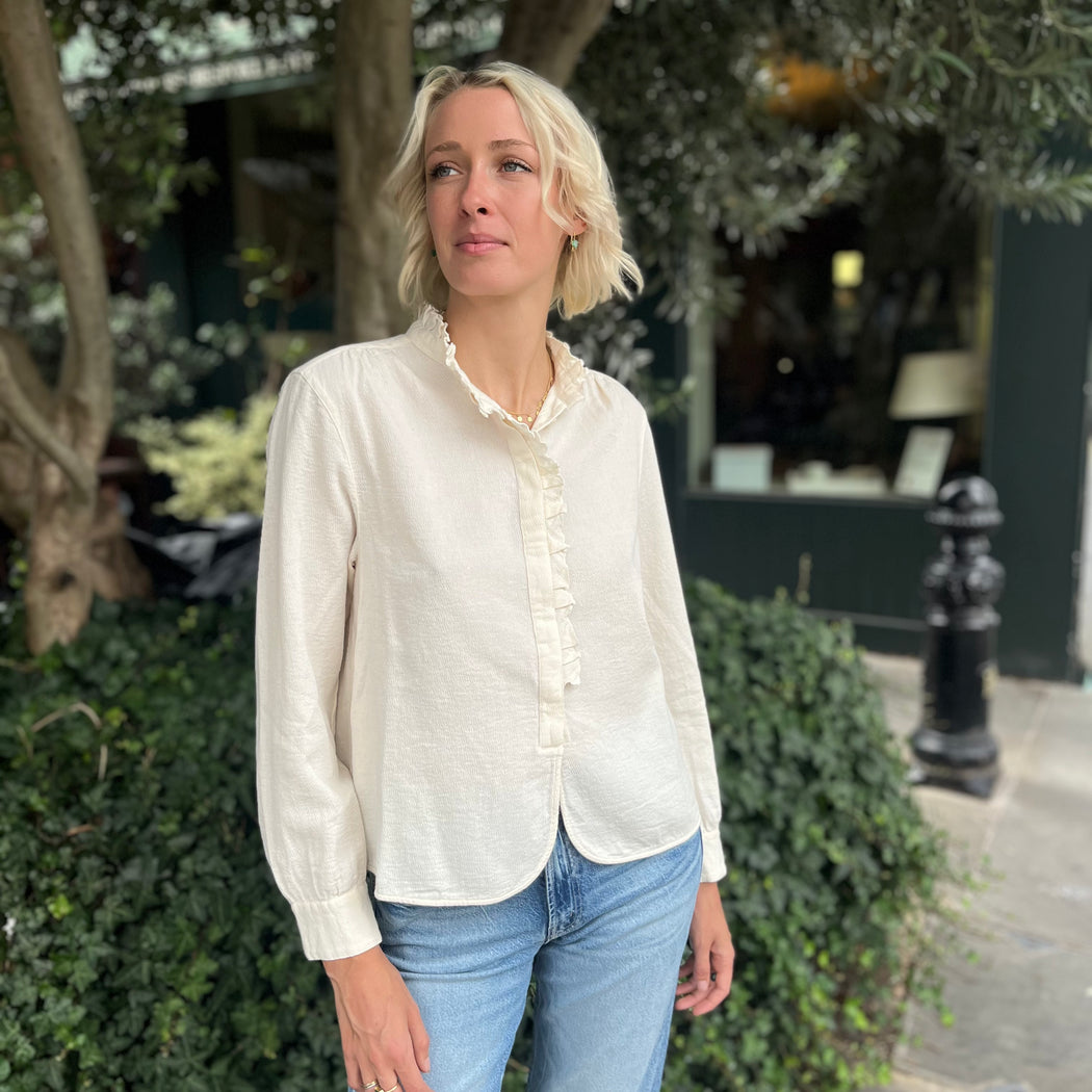 Crafted in a soft woven cotton and wool blendf with a tailored cut. Feminine frill details mixed with a autumnal texture makes for an everyday piece. This top has a regular fit.