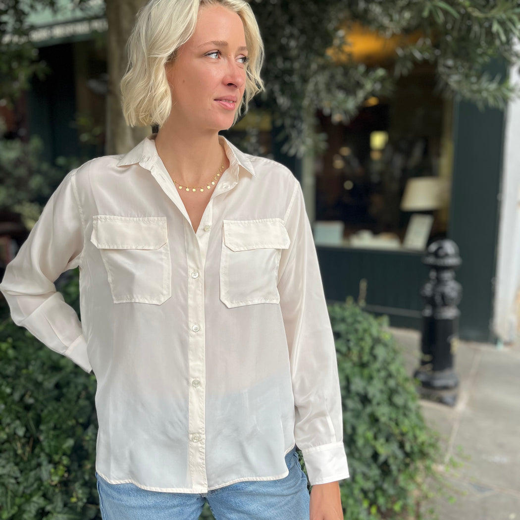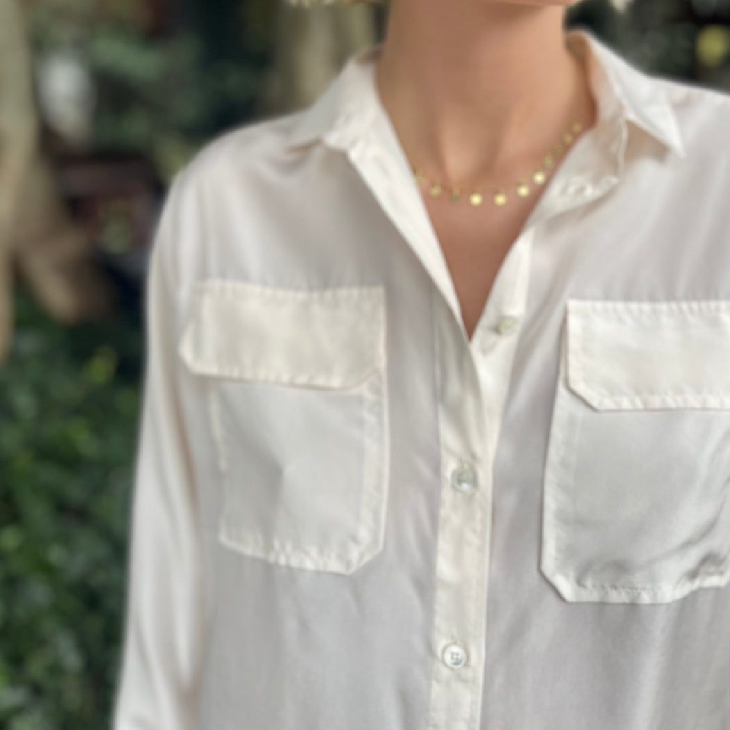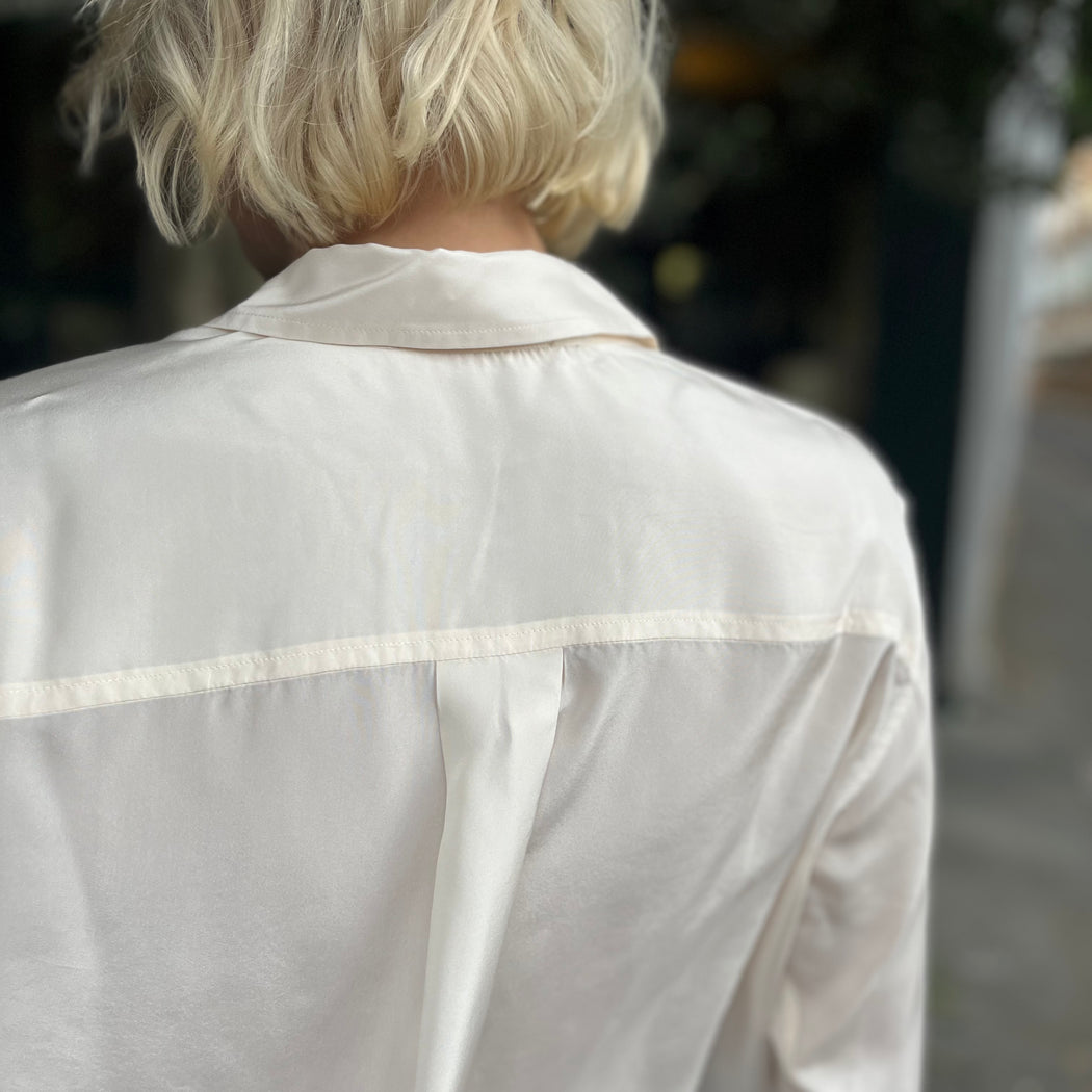 Crafted in a luxurious habotai silk mixed with classic tailoring, with the addition of front patch pockets. A flowing fluid silhouette, ensuring luxury comfort. This shirt has an oversized fit, we recommend taking a size down.