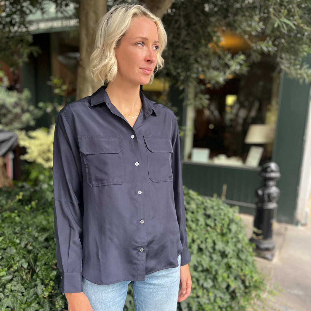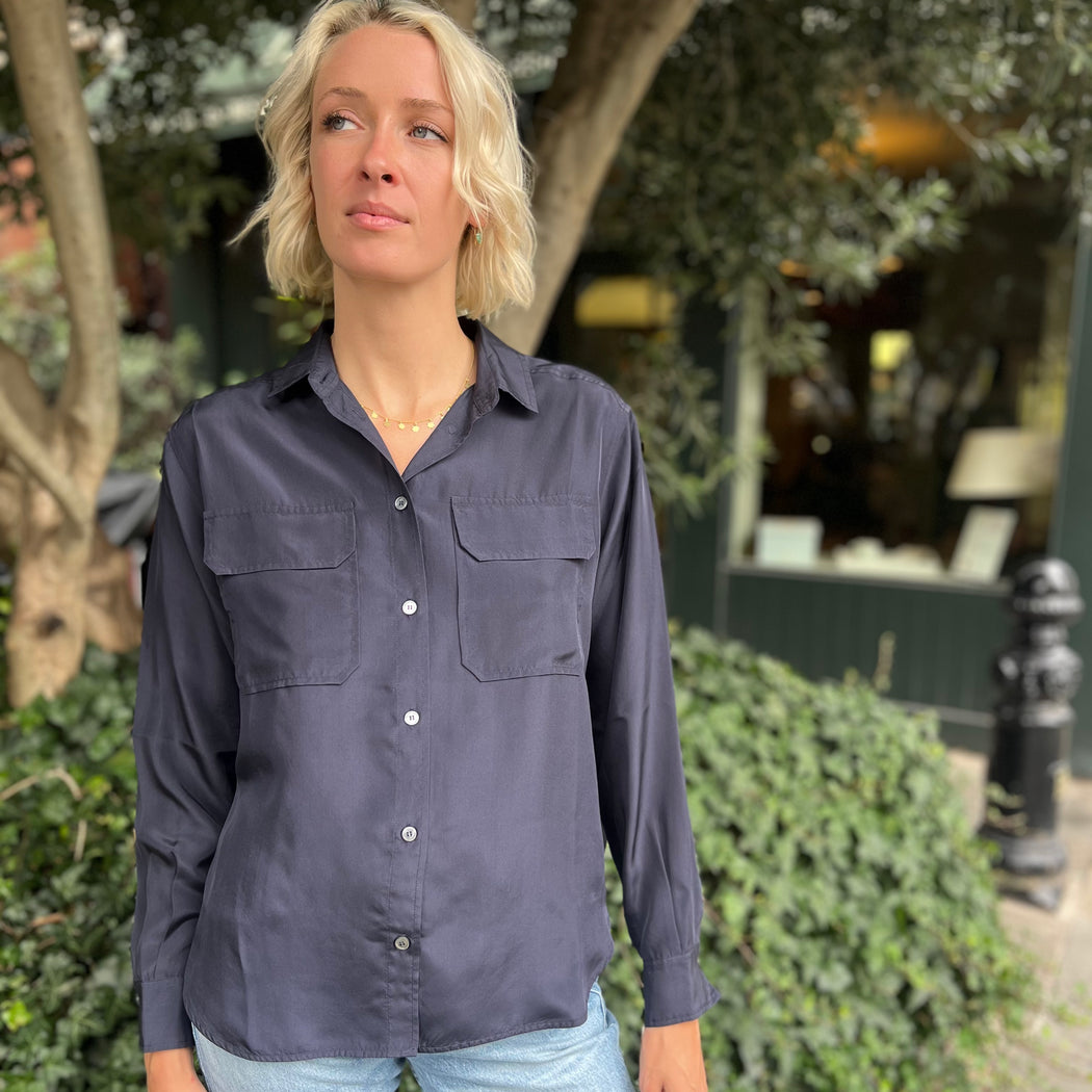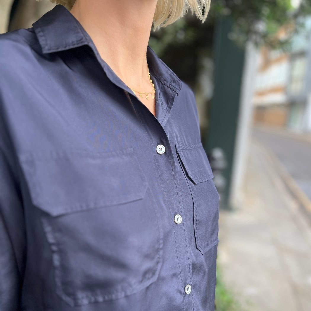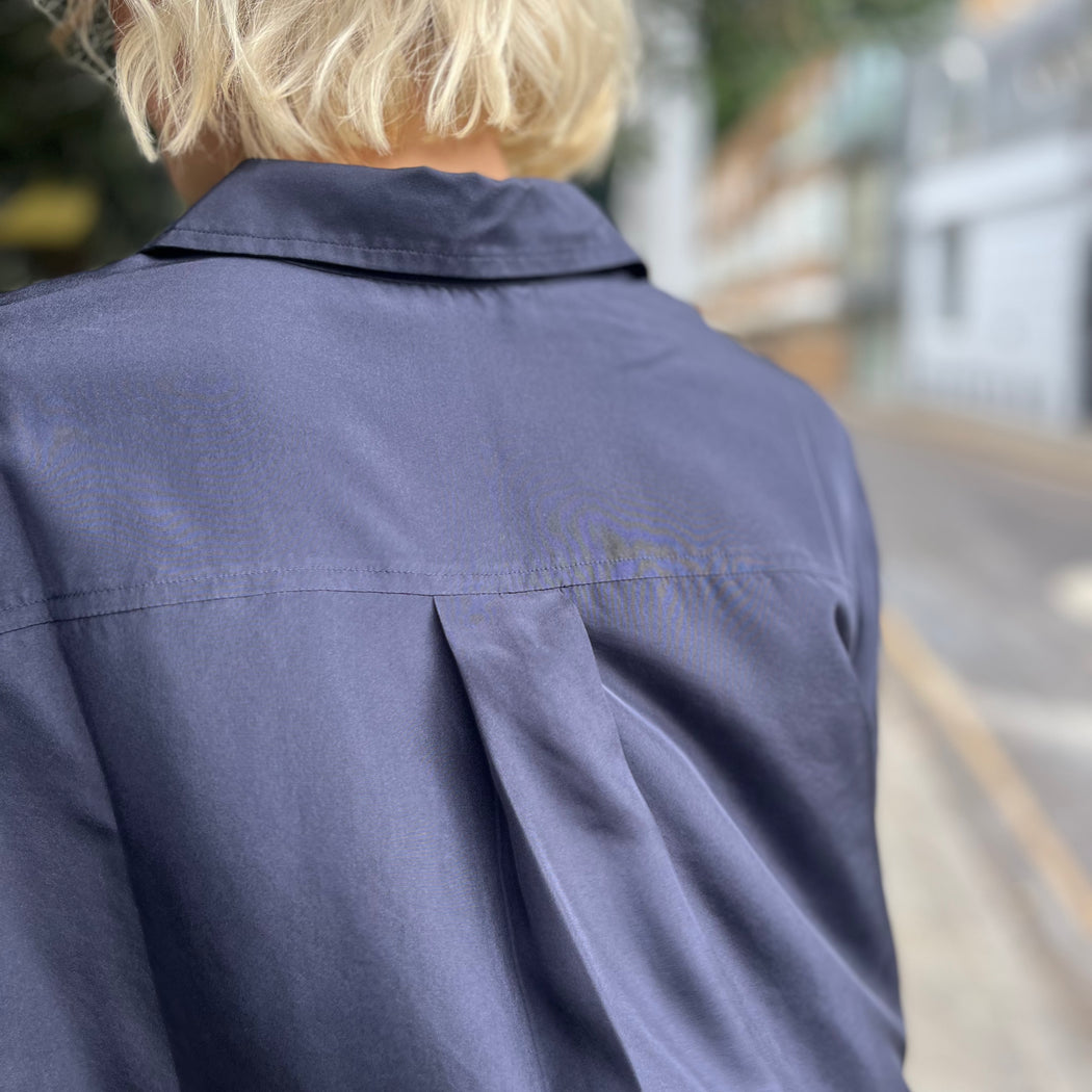 Crafted in a luxurious habotai silk mixed with classic tailoring, with the addition of front patch pockets. A flowing fluid silhouette, ensuring luxury comfort. This shirt has an oversized fit, we recommend taking a size down.