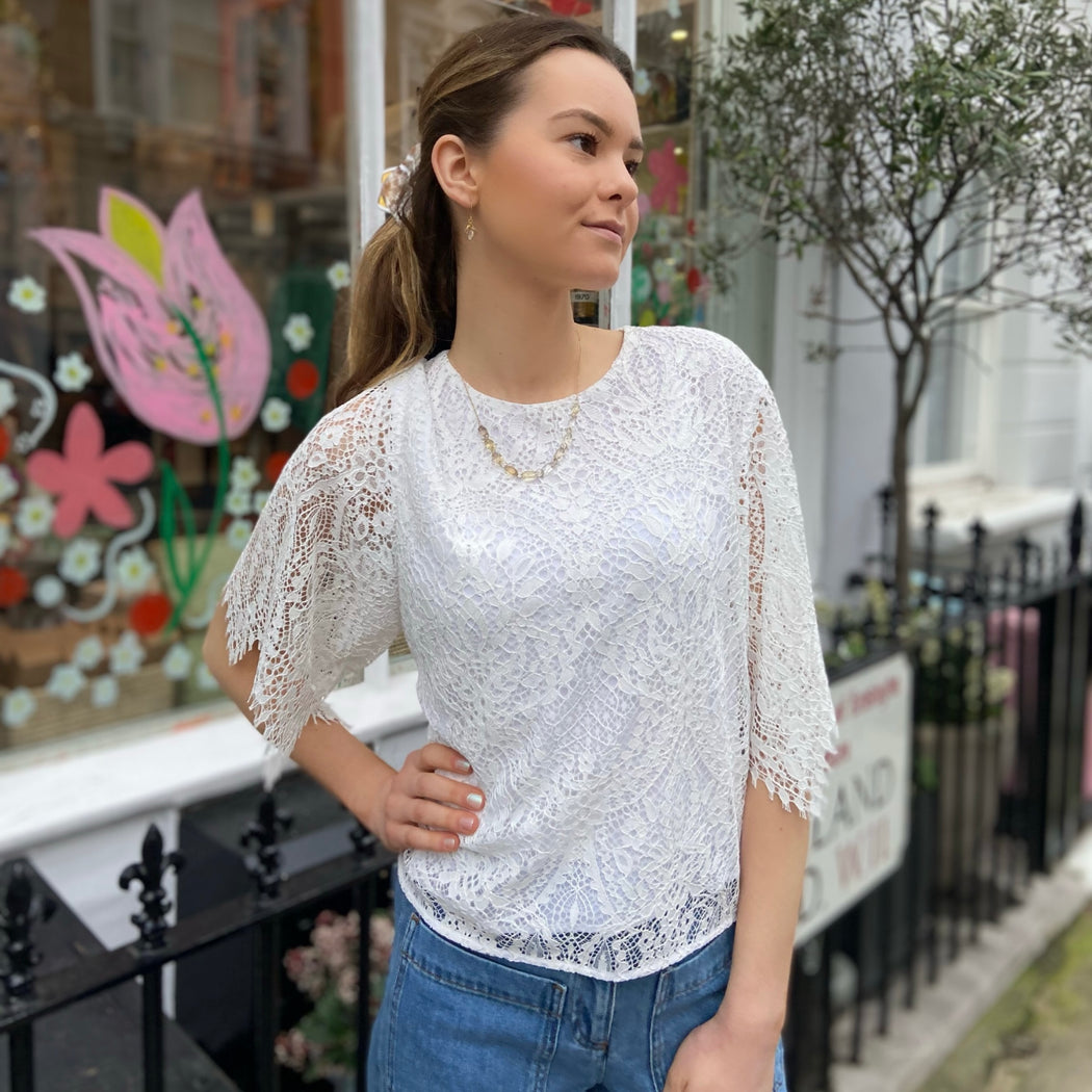 A classic t-shirt shape crafted in a beautiful soft lace. A boxy shape with feminine sleeves and a crewneck.