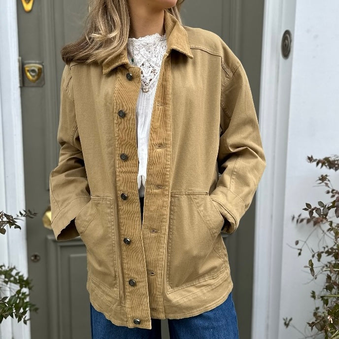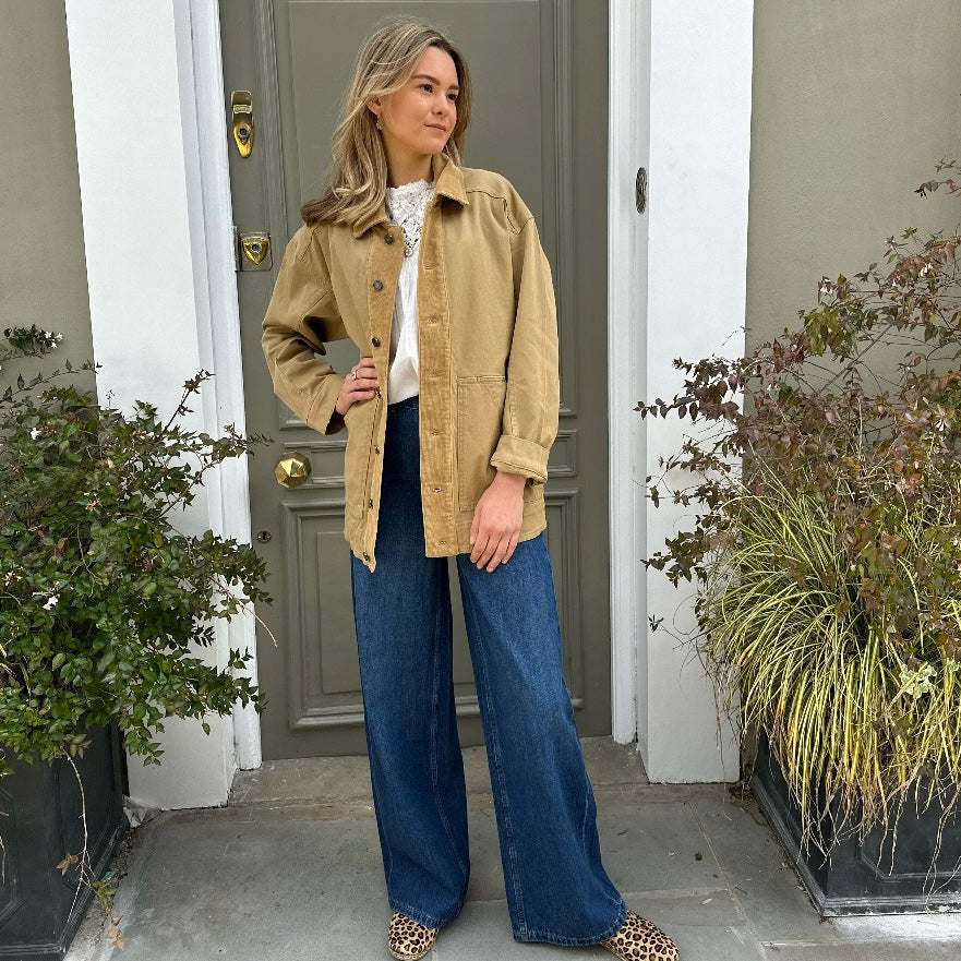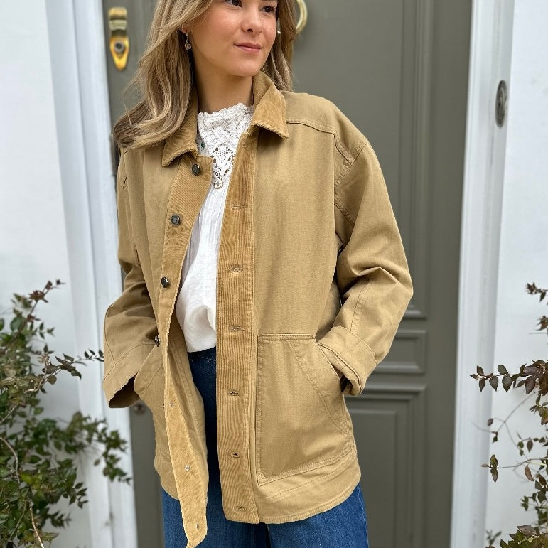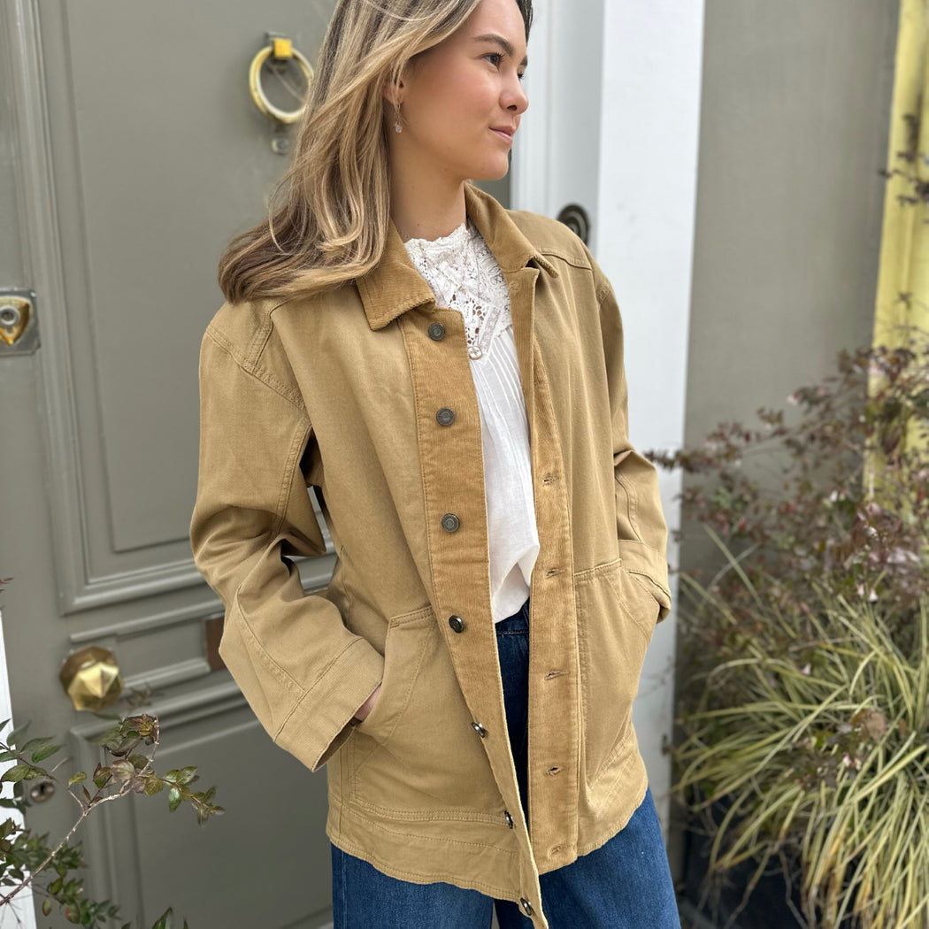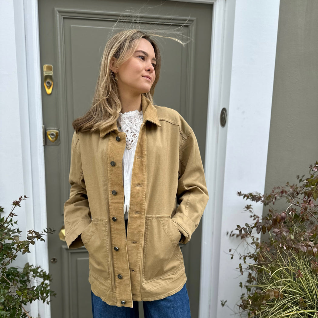 The Dracy takes notes from a classic workers jacket, crafted from a stiff cotton with corduroy details. Secure buttons down the front and pockets. A relaxed fit with room to wear a knit underneath.